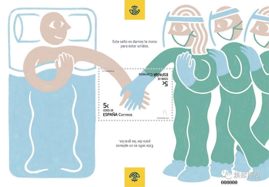 同时,邮票面值(5欧元)、COVID-19字样、西班牙邮政名称等内容则在邮票左下方和右上方分别呈对倒印制。该设计的巧妙之处在于,从正面看,邮票是双手相连的图案,若将小型张倒置观看,则呈现双手鼓掌的造型。西班牙邮政这一设计的目的在于既体现出疫情期间人们之间的相互帮助,同时也为战斗在抗疫一线的各类工作者鼓掌喝彩。