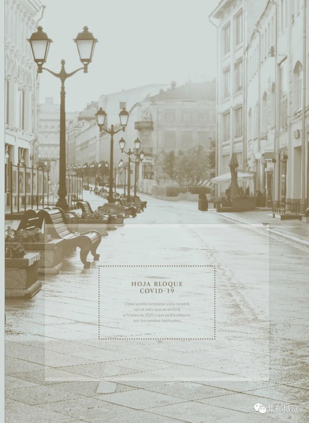 另悉,西班牙邮政曾于今年7月发行《抗击新冠肺炎》题材专题册(图4),内含西班牙历年发行的总计24枚医学相关题材的邮票(图5)。在今年7月发行该抗疫专题册时,本次的小型张尚未发行,但专题册为10月1日发行的小型张预留了位置(图6),该页的背景图案为新冠肺炎疫情期间冷清的街道。现在,集邮者购买该小型张后可插放在该页的护邮袋中,这样这本专题册才算完整。该枚小型张可称得上是这本抗疫专题册的“镇宅之宝”!