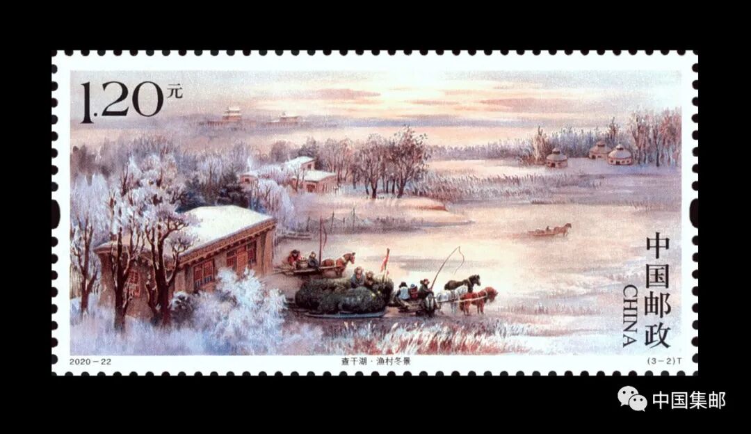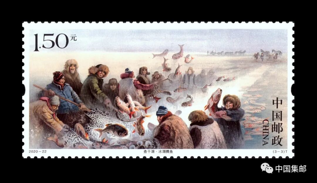 《查干湖》特种邮票一套3枚,邮票图案名称分别为:圣湖如画、渔村冬景和冰湖腾鱼。全套邮票面值为 3.90 元。邮票采用水彩画的表现方式,同时兼具中国传统绘画的章法和构图特点,用色浓淡相宜、虚实有度,画面通透细腻、层次丰富,形成了独特的审美意蕴,在展现查干湖深厚渔猎文化底蕴的同时,呈现出一幅人与自然和谐共生、相互依存的美好景象。