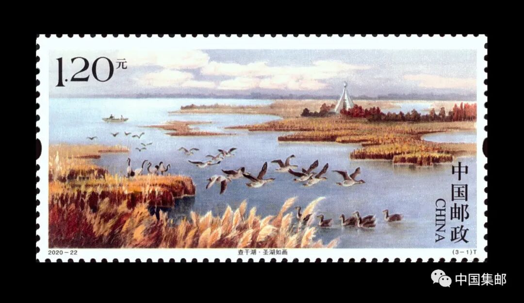 第一枚名为“圣湖如画”,表现秋季查干湖碧波荡漾、芦苇摇曳、水鸟翔集的静谧壮美的景色。远处点缀查干湖畔的引松工程纪念碑。