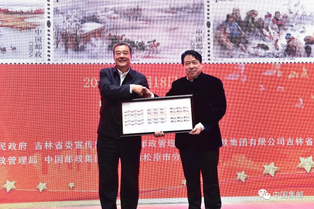 在邮票首发式上,中国集邮总公司党委书记、总经理任永信向松原市委副书记、市长于强赠送编号为1的《查干湖》整版邮票。