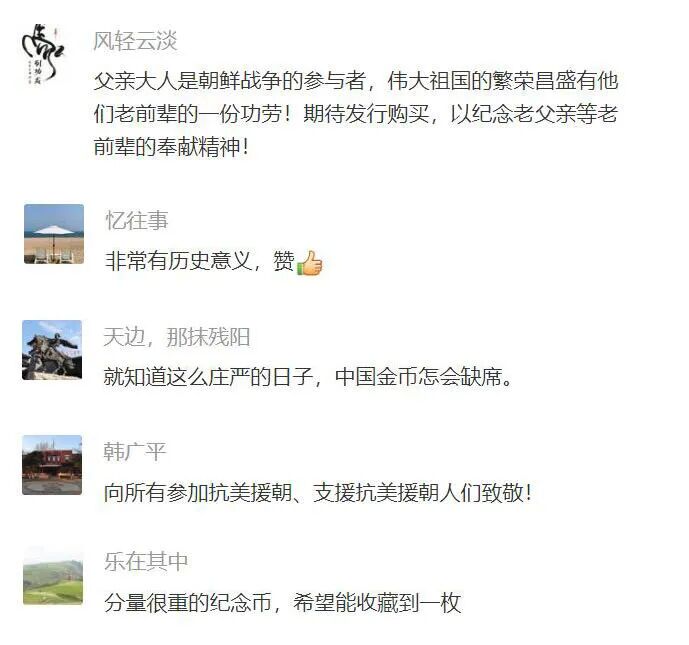 公告发出后,广大微友们纷纷表达了对抗美援朝志愿军的缅怀与敬意,以及对这套纪念币的喜爱之情。