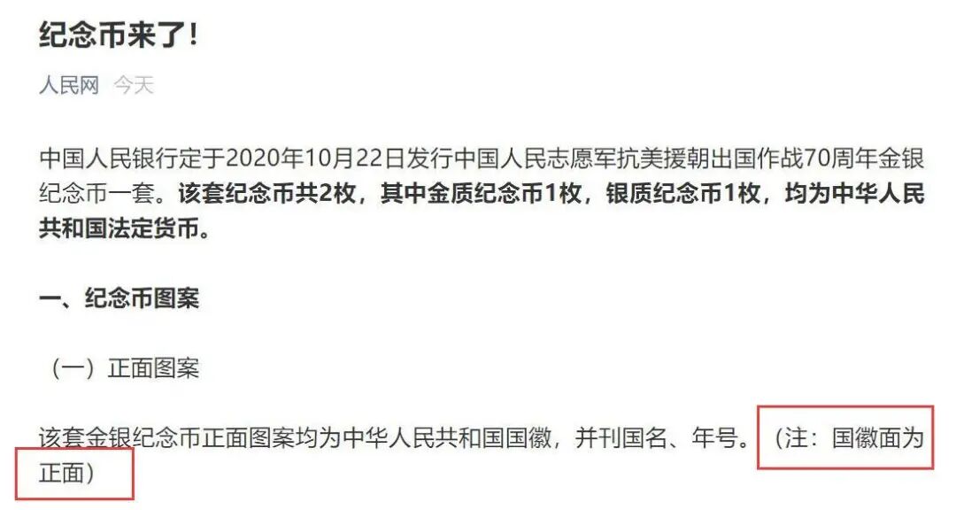 近日,中国人民银行发布公告,将于10月22日发行中国人民志愿军抗美援朝出国作战70周年金银纪念币一套,该套纪念币共2枚,其中金质纪念币1枚,银质纪念币1枚,均为中华人民共和国法定货币。
