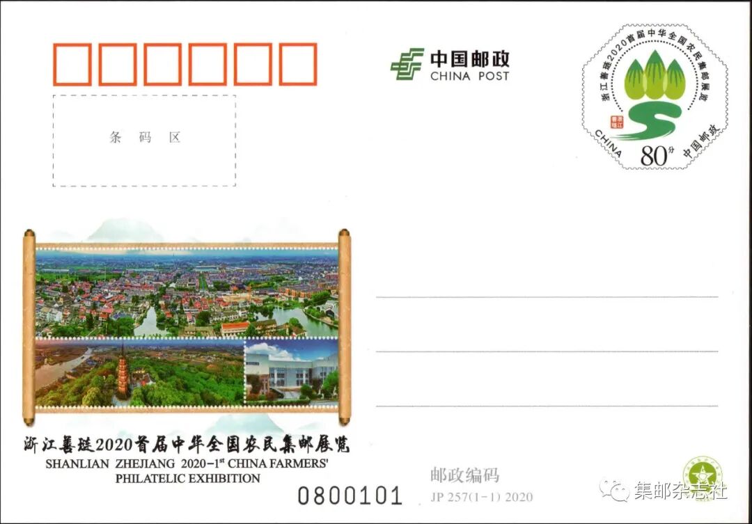 中国邮政定于2020年10月31日发行《浙江善琏2020首届中华全国农民集邮展览》纪念邮资明信片一套1枚。详情如下:
