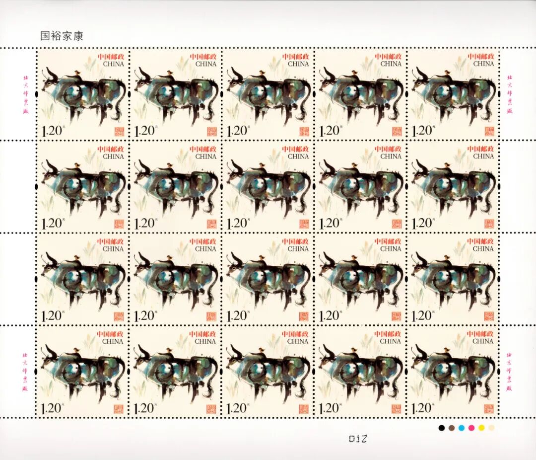 中国邮政定于 2020 年 11 月 5 日发行《国裕家康》、《新春送福》贺年专用邮票 2 枚,邮票图名分别为国裕家康、新春送福,面值分别为1.20元、3元。邮票设计者:陈楠,《国裕家康》原画作者:韩美林。采用2枚邮票印制小全张1枚,小全张边饰福字作者:韩美林,专用于 2021 年中国邮政贺年有奖产品。