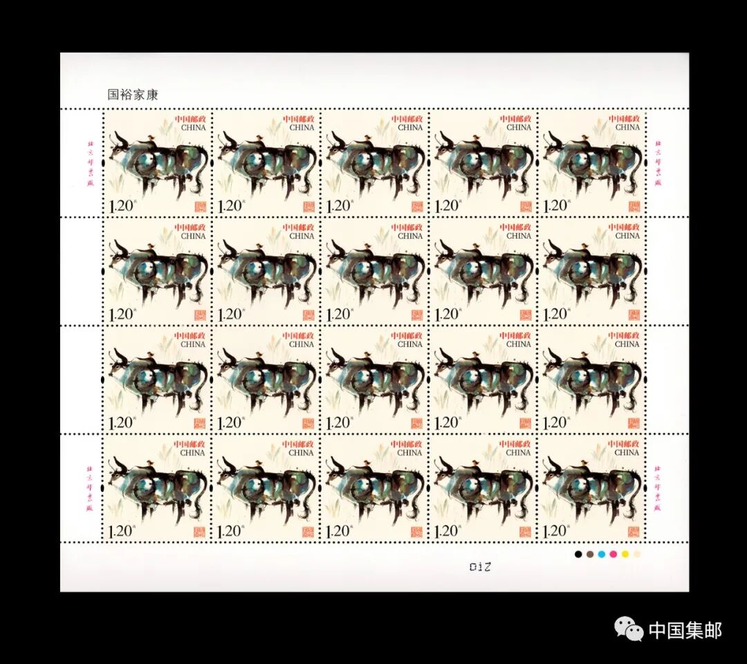中国邮政定于 2020 年 11 月 5 日发行《国裕家康》、《新春送福》贺年专用邮票 2 枚,邮票图名分别为国裕家康、新春送福,面值分别为1.20元、3元。邮票设计者:陈楠,《国裕家康》原画作者:韩美林。采用2枚邮票印制小全张1枚,小全张边饰福字作者:韩美林,专用于 2021 年中国邮政贺年有奖产品。