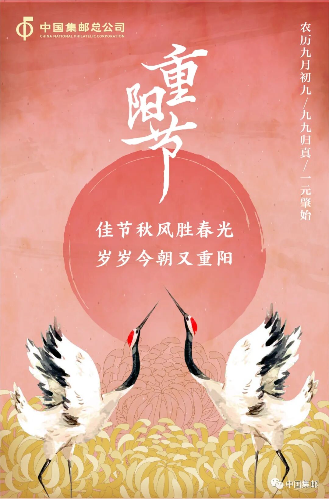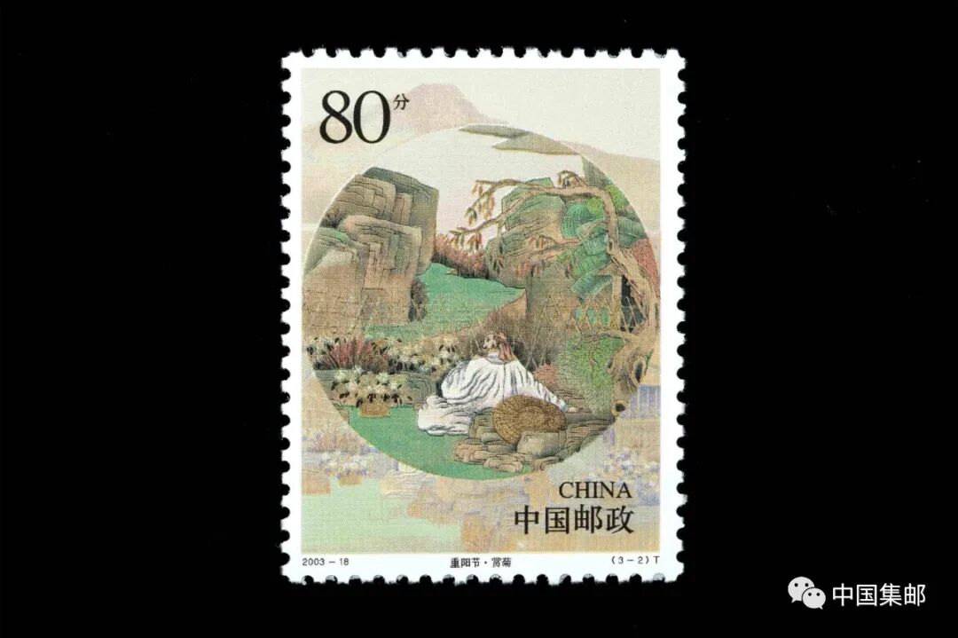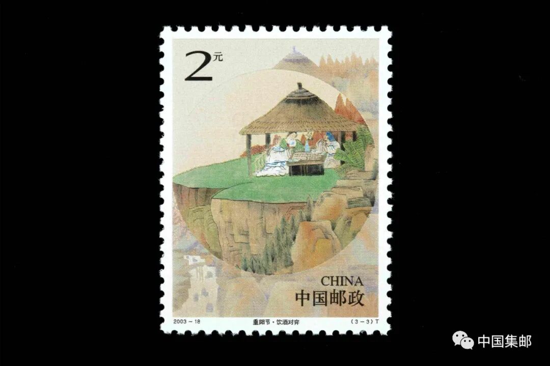 中国邮政曾在2003年10月4日,农历九月初九,发行《重阳节》邮票一套3枚。邮票以中国传统的工笔画形式设计,侧重水墨泼染,讲究环境氛围衬托,刻意体现悠闲惬意的意蕴。在构图处理上,设计了一个“圆”置于“方”形邮票中心,宛若一幅景色优美的丹青画卷,展示了重阳节传统的民俗活动风情。