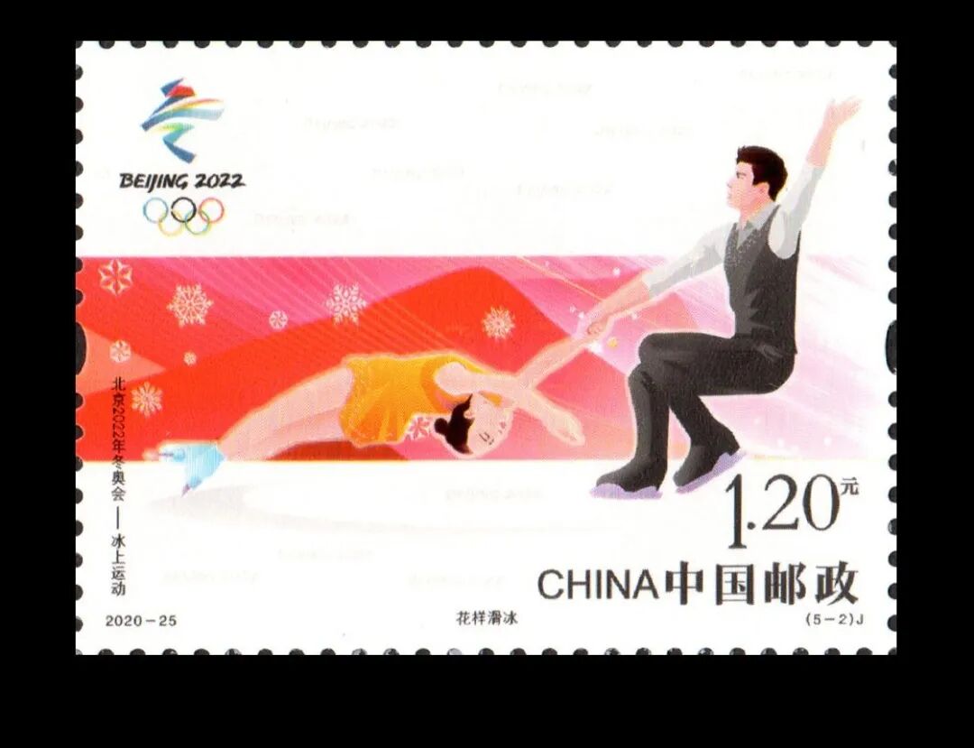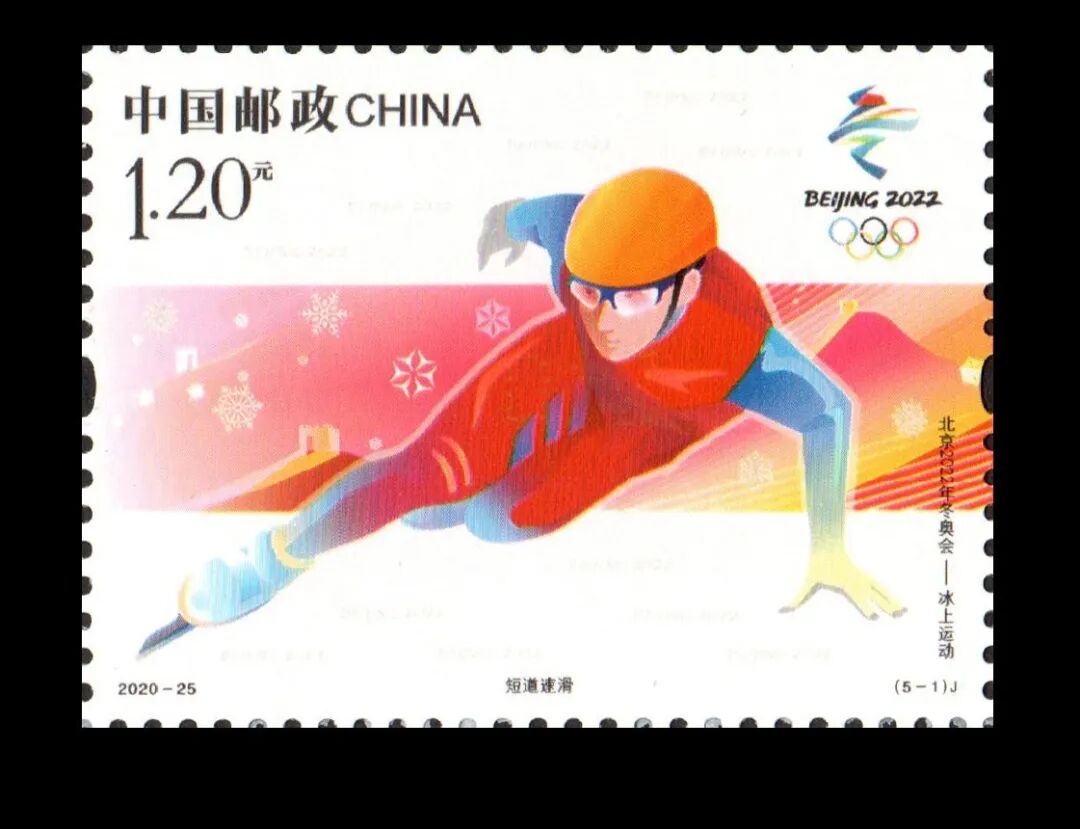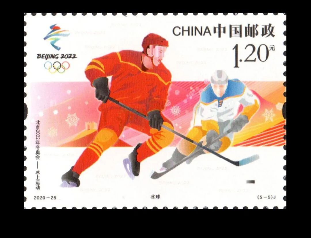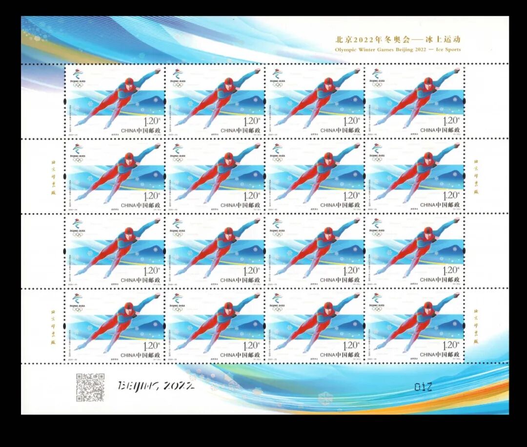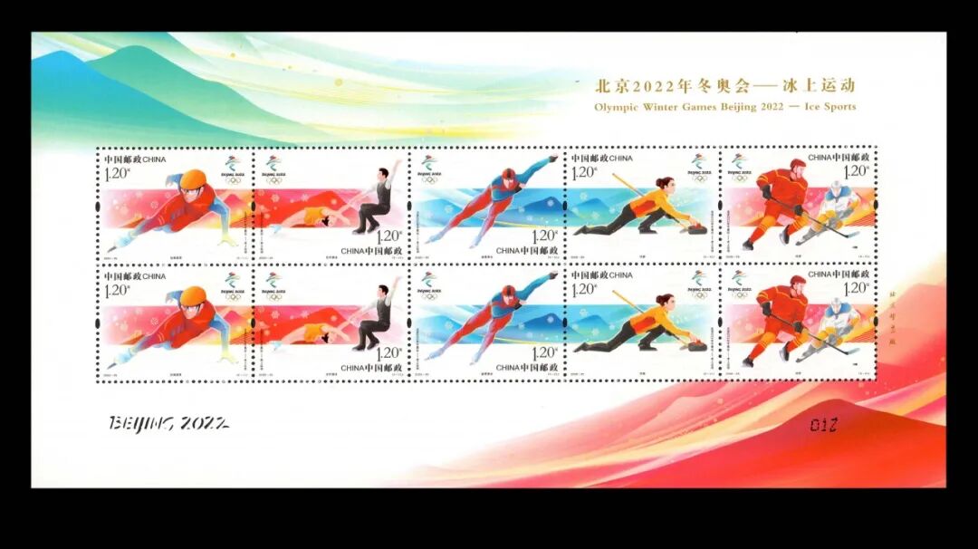 中国邮政定于2020年11月7日发行《北京2022年冬奥会——冰上运动》纪念邮票一套5枚。邮票图案名称分别为:短道速滑、花样滑冰、速度滑冰、冰壶、冰球。全套面值6元,计划发行量版式一870万套,版式二200万套(100万版)。
