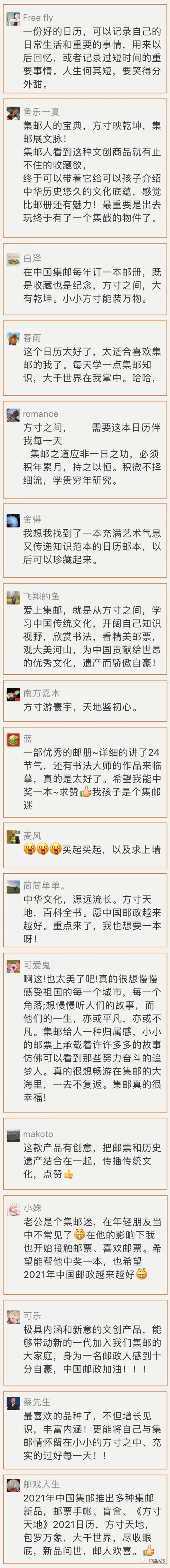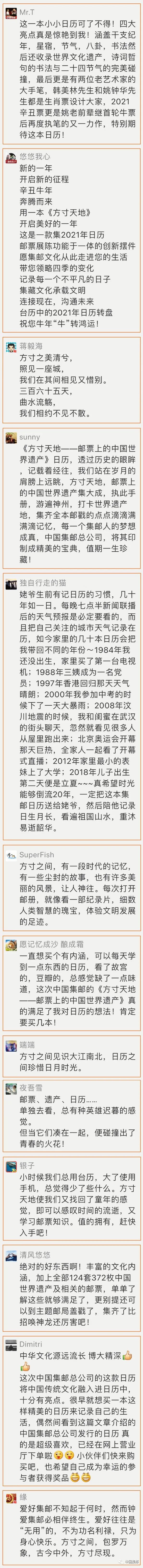 【开奖啦】 10月26日我们发布的文章 《方寸天地》日历2021版全新亮相(留言有奖)留言获奖名单现在揭晓! 以下留言的粉丝均可获得这本 《方寸天地——邮票上的中国世界遗产》日历2021版!