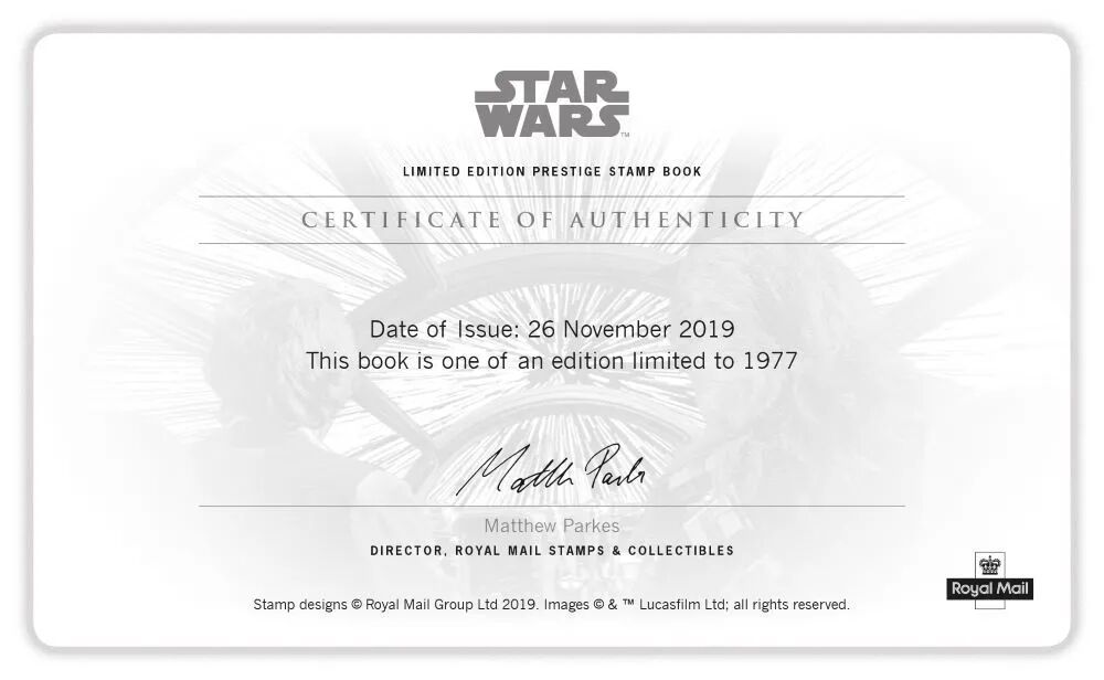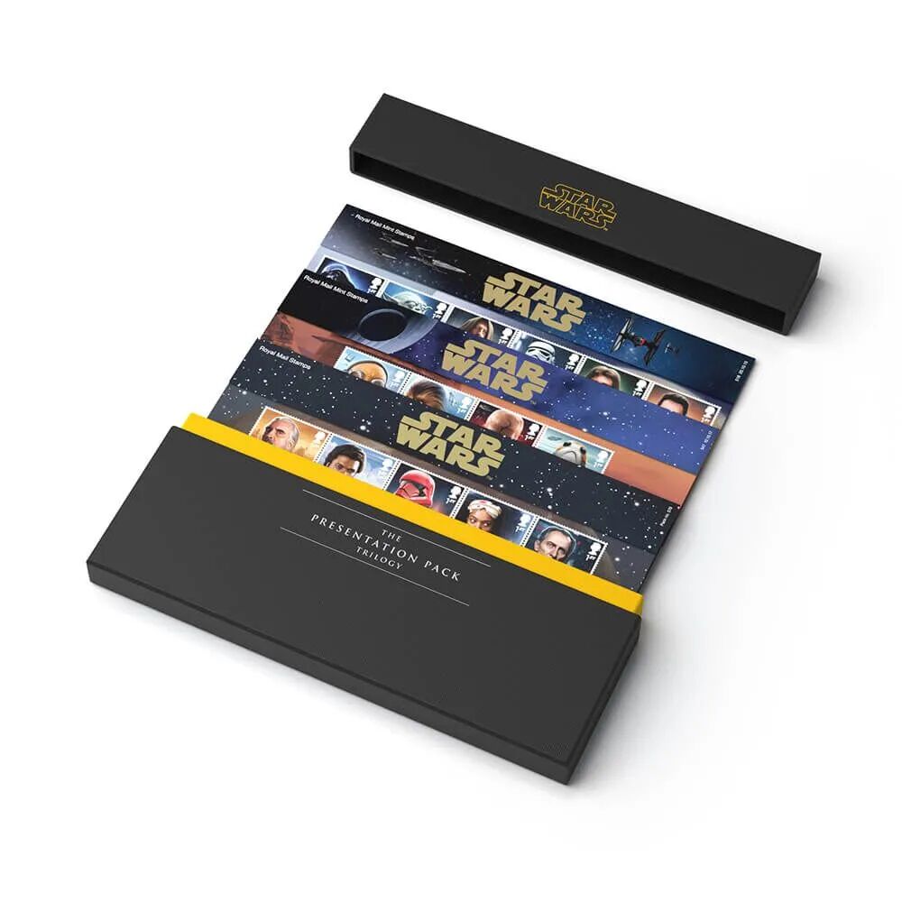 2019年发行了星球大战后传三部曲合集,包含三年星战电影中的人物邮票,共30枚。此外,还有专为铁粉们开发的星战9限量版精装本票,限量发行1977本(1977年正是第一部星战电影上映日期),每套均含收藏证书。