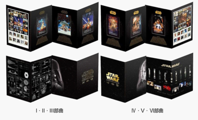 面对这么好玩的IP,邮票没有缺位。日本邮政在2017年星战系列电影推出40周年之际开发了最新星战主题邮票套装,完整收录了星战电影前六部的经典影像。邮票套装共有两组,分别是年代较早的I·II·III 部曲和星战前传 Ⅳ·V·Ⅵ 部曲。每组包括10枚邮票表现电影中的经典人物,以小全张形式呈现。另外还附赠12张特制明信片、3张电影海报卡片和1个飞船简析图资料夹。