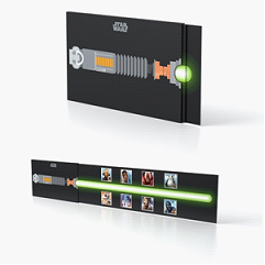 2017年发行的星球大战光剑展示套折,设计成电影中经典的光剑形象,随着封套内三层折叠卡纸的缓慢抽出,一把完整的光剑就呈现出来。