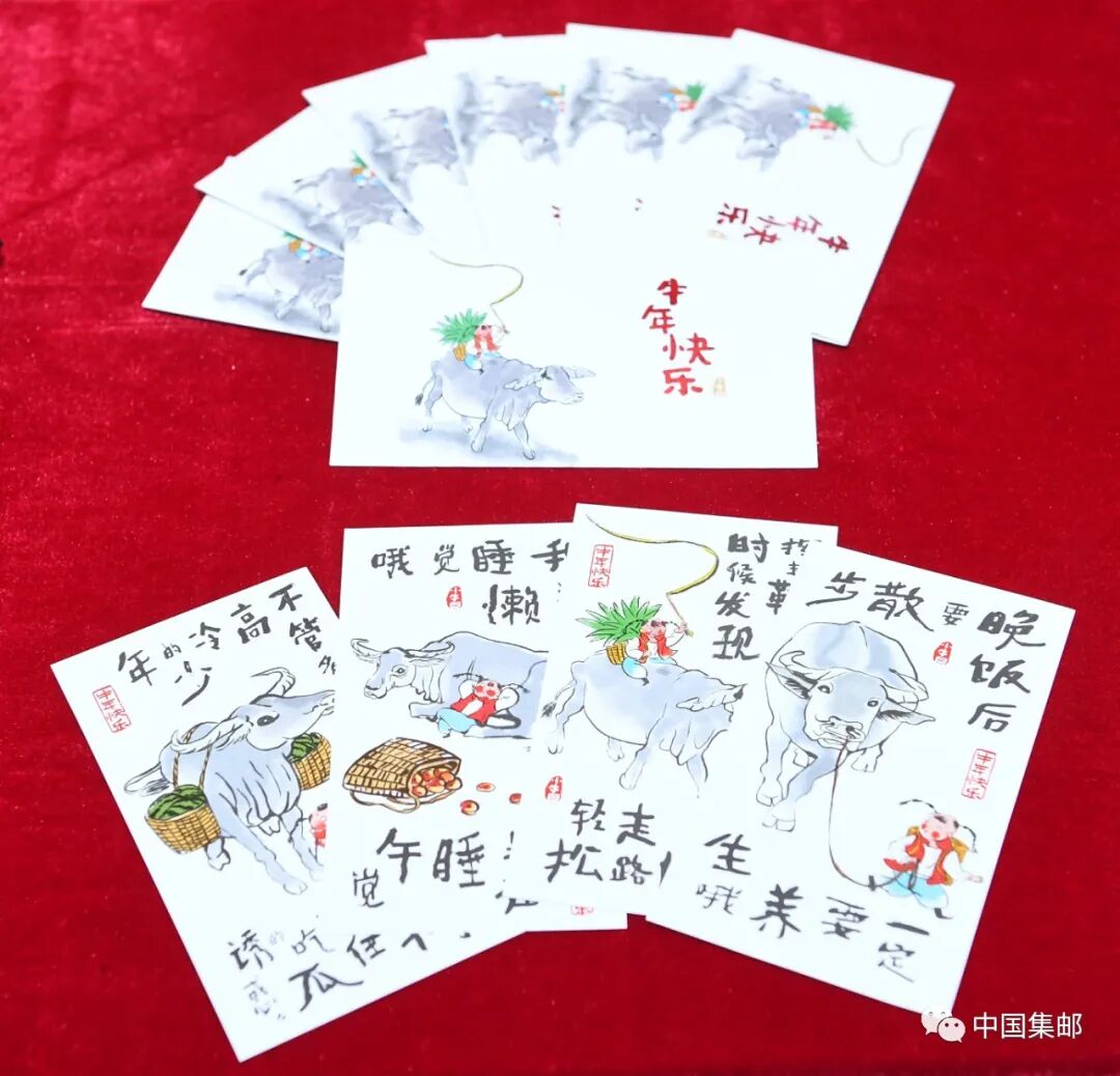 《牛年快乐》普通明信片的邮资图选取了第二轮生肖牛邮票剪纸原作者齐秀花的作品,由王虎鸣设计,画面中的牛昂首向上、充满力量。两套明信片分别采用水彩绘画及水墨手绘形式,画面温暖充满童趣,展现出浓厚的春节民俗特色,分别由景绍宗及段雅婕、潘振磊设计。《辛丑吉祥》极限明信片由韩美林先生设计指导,明信片正面左下角图案及背面图案与邮资图相同,形成极限概念,四枚明信片广告面可组成完整的“恭贺新春”吉祥短语。祝福卡《牛年如意》《新春送福》,画面以健硕而充满活力的牛为主要形象,传递国裕民康的良好祝愿,分别由张旺、武世宁设计。