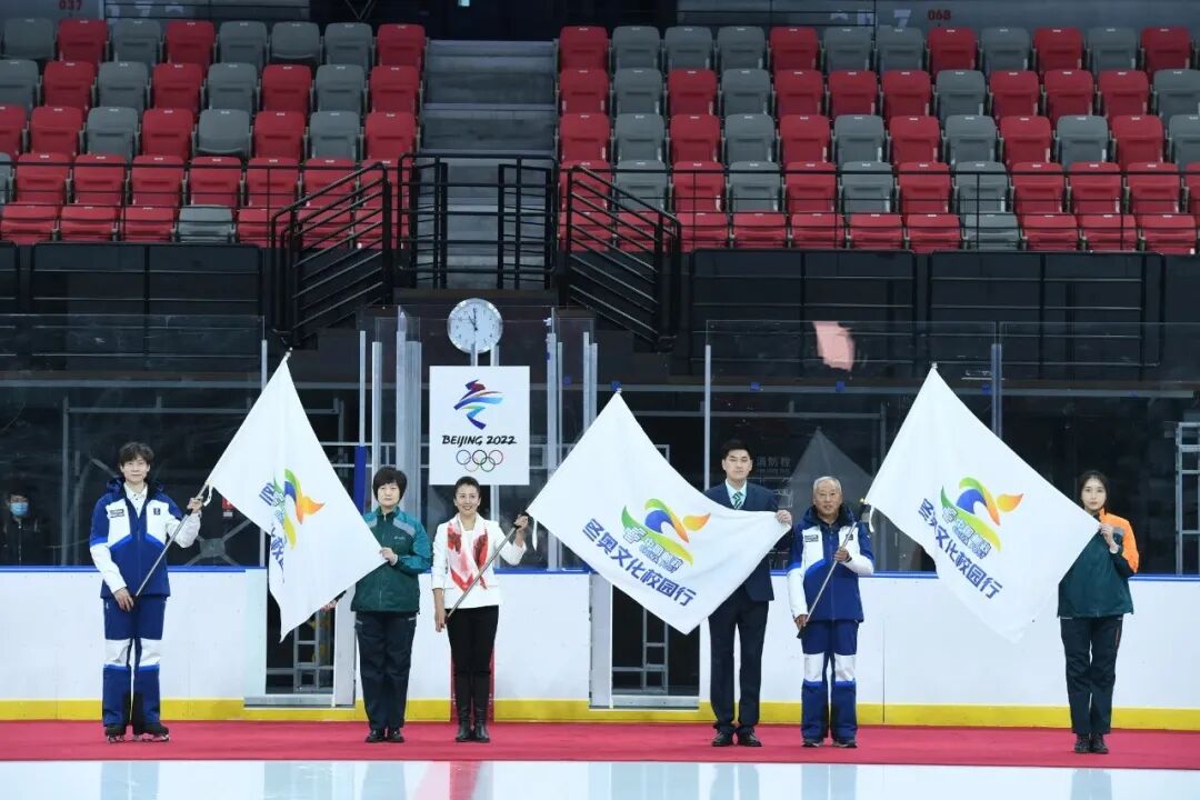 1980年美国普莱希德湖第十三届冬奥会中国代表团旗手赵伟昌、2006年意大利都灵第二十届冬奥会中国代表团旗手杨扬以及2014年俄罗斯索契第二十二届冬奥会中国代表团旗手佟健共同向三位北京邮政冬奥文化服务队代表授旗,宣告“中国邮政冬奥文化校园行”活动正式启动。