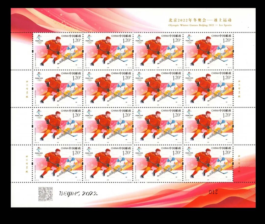《北京2022年冬奥会——冰上运动》纪念邮票1套5枚,邮票图案分别表现了短道速滑、花样滑冰、速度滑冰、冰壶和冰球全部5个冰上运动项目。运动员代表杨扬、庞清、佟健、张虹、周妍和姚乃峰分别为5枚邮票揭幕。