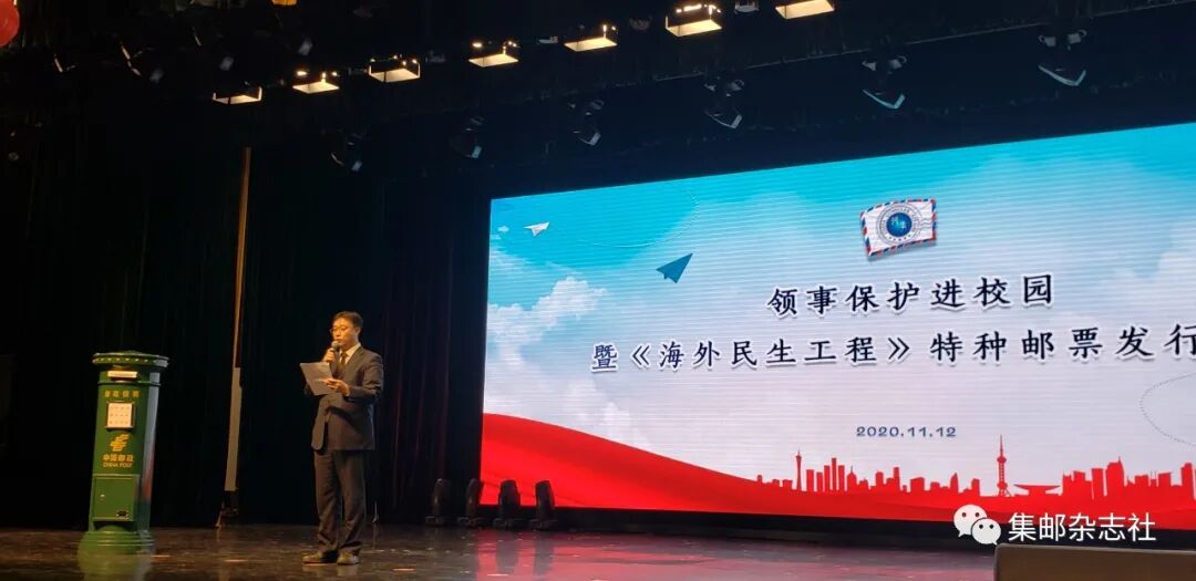 11月12日,领事保护进校园暨《海外民生工程》特种邮票发行活动在北京第四中学举办。外交部领事司司长崔爱民、副司长陈雄风、国家邮政局普服司副巡视员张宏卫、中国邮政集团有限公司邮务部副总经理曹建申等出席。