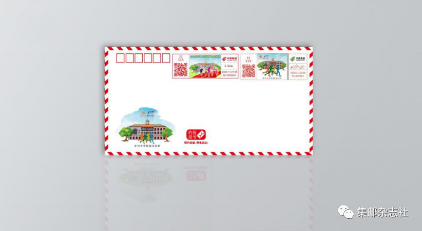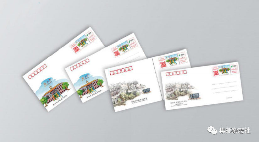 “苏大风情•苏州大学马拉松”自助式邮资机宣传戳纪念封片合集由加盖4.20元面值的自助式邮资宣传戳(苏大钞券封)和加盖 3.80元面值的自助式邮资宣传戳(苏大雕刻版明信片)各1枚以及加盖1.20元面值自助式邮资机宣传戳纪念封和加盖0.80元面值自助式邮资机宣传戳明信片各1枚组成,于11月21日挂号实寄给预订者。2枚低值封、片将使用“2020苏州大学校园马拉松赛”彩色邮资机宣传戳补资。