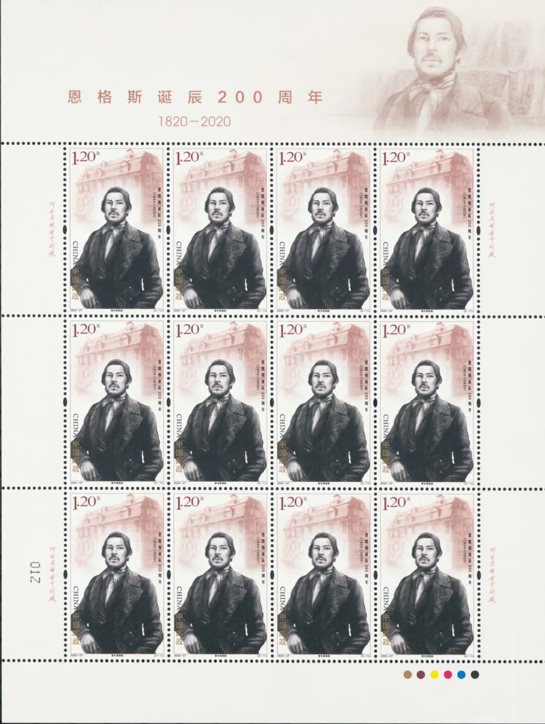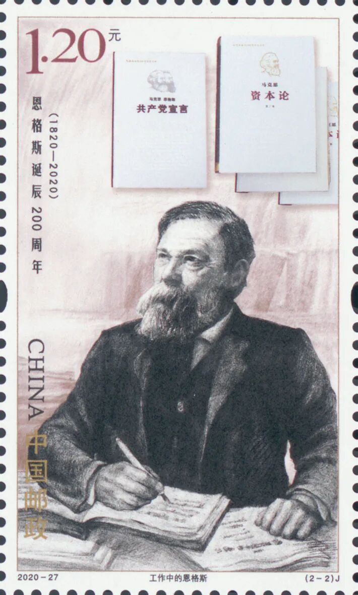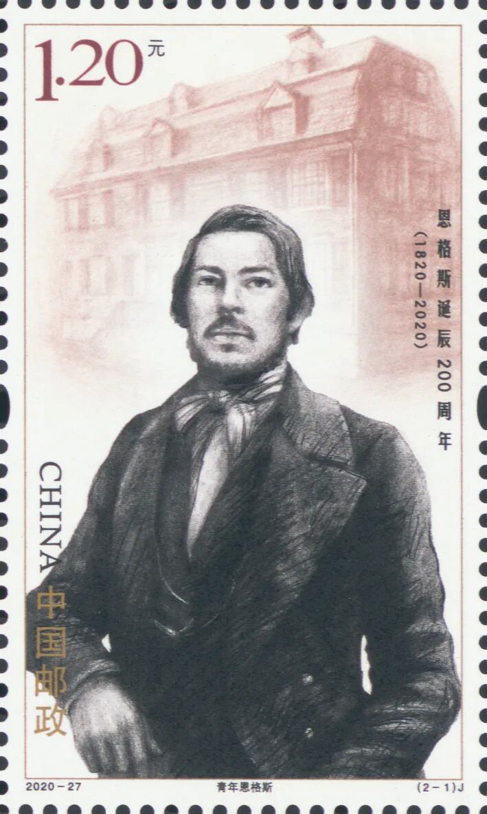 中国邮政定于2020年11月28日发行《恩格斯诞辰200周年》纪念邮票一套2枚。邮票图案名称分别为:青年恩格斯、工作中的恩格斯。全套邮票面值为2.40元。计划发行数量为750万套。