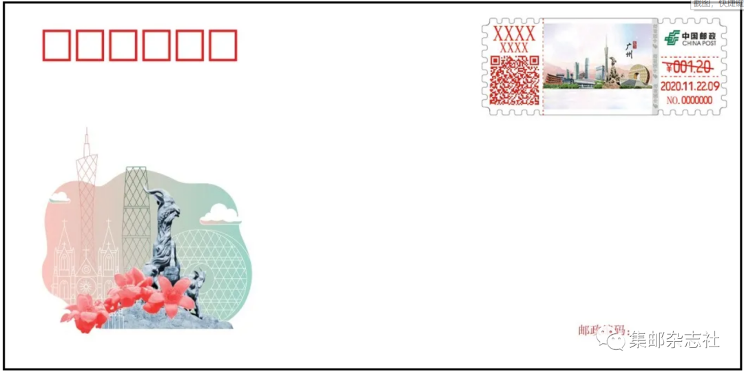 为配合此次文化展的举办,经中国邮政集团有限公司批准,广东省邮政分公司将启用“2020年广州文创展”自助式邮资机宣传戳2枚,这两枚邮资机宣传戳是“2020年广州文创展和首届自动化邮资机宣传戳文化展”自助式邮资机宣传戳的其中的一部分,另两枚将于11月24日在广东东莞启用。