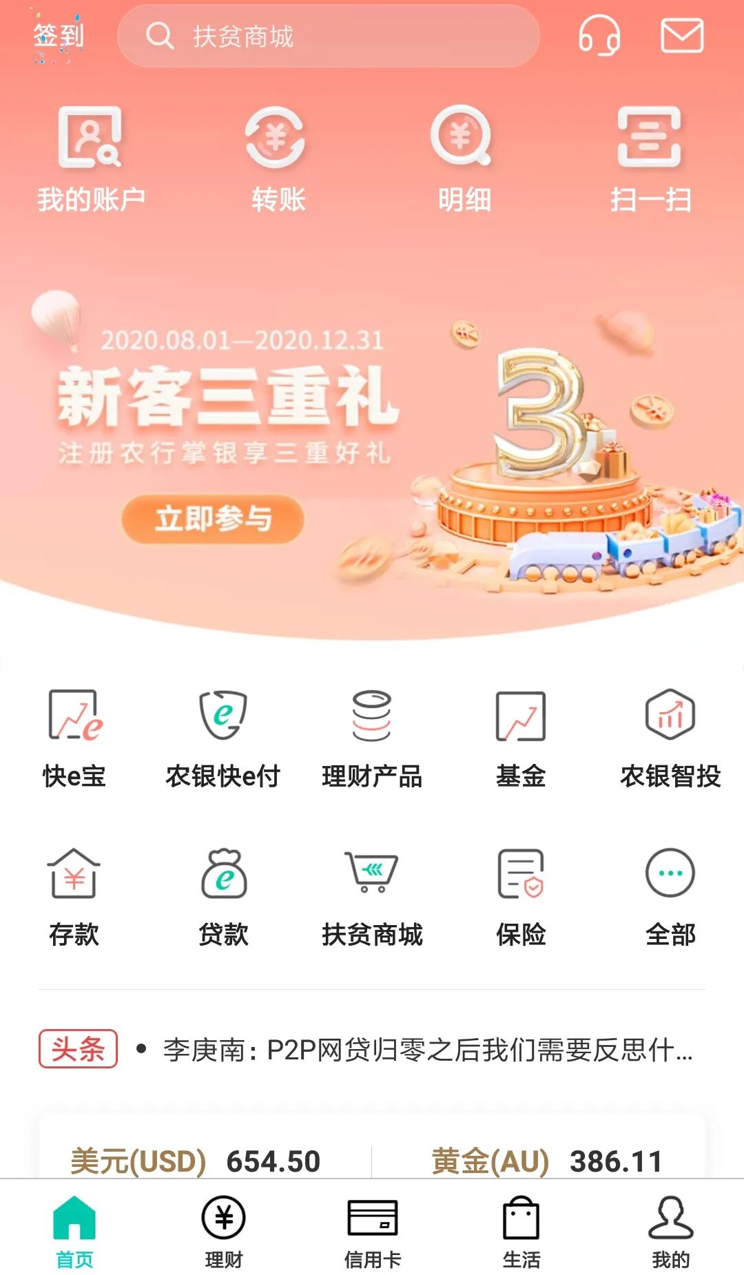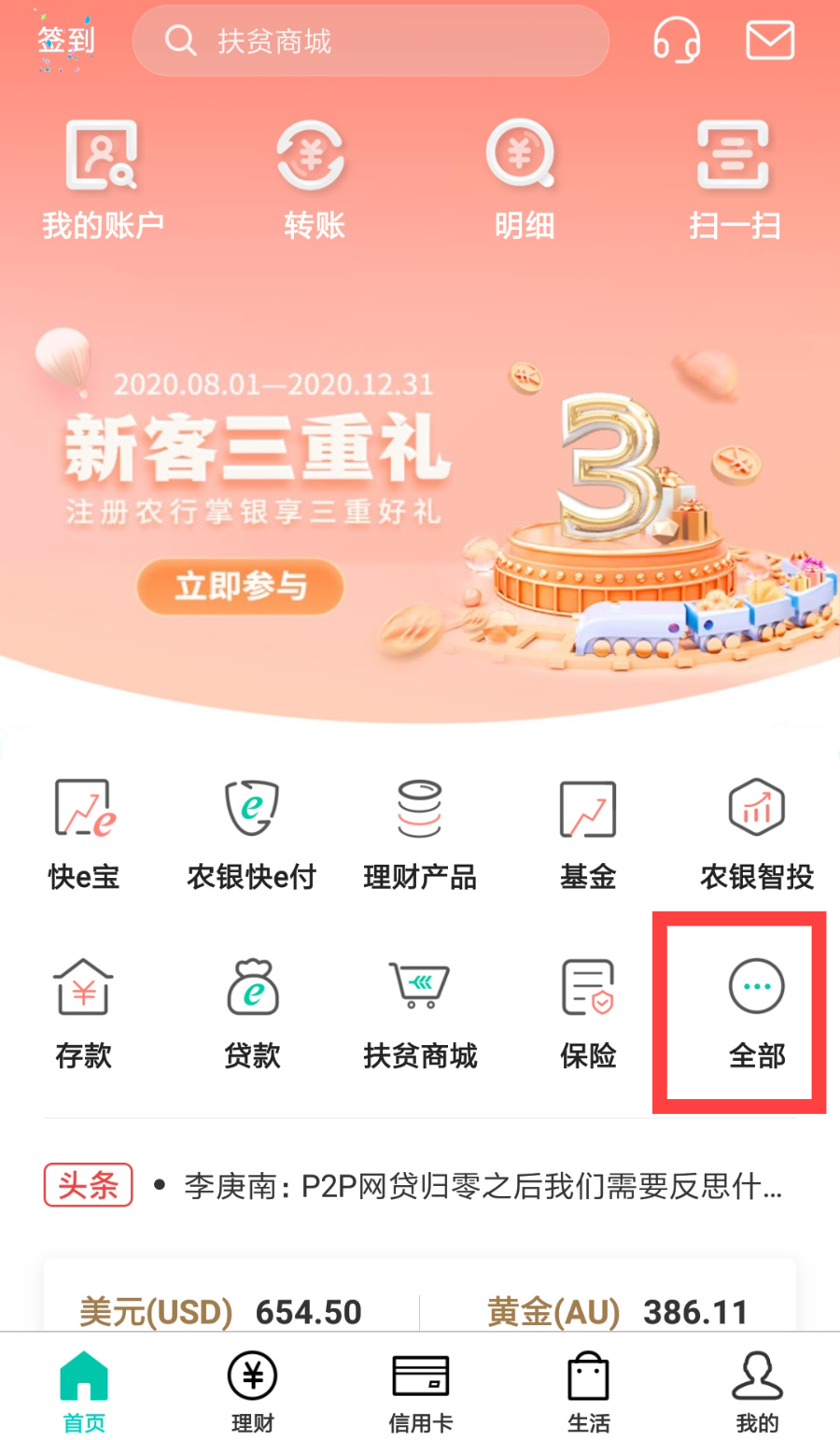 第一步:打开农行APP进入首页。不需要登录,也不需要农行卡。