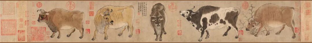 故宫博物院院藏的《五牛图》卷,是唐朝韩滉创作的黄麻纸本设色画,迄今约有1300年的历史。画上五头牛从右至左一字排开,形象不一,姿态各异。是目前所见最早作于纸上的绘画,也是为数寥寥的几件唐代纸绢绘画真迹之一。不论其艺术成就还是历史价值都备受世人关注。