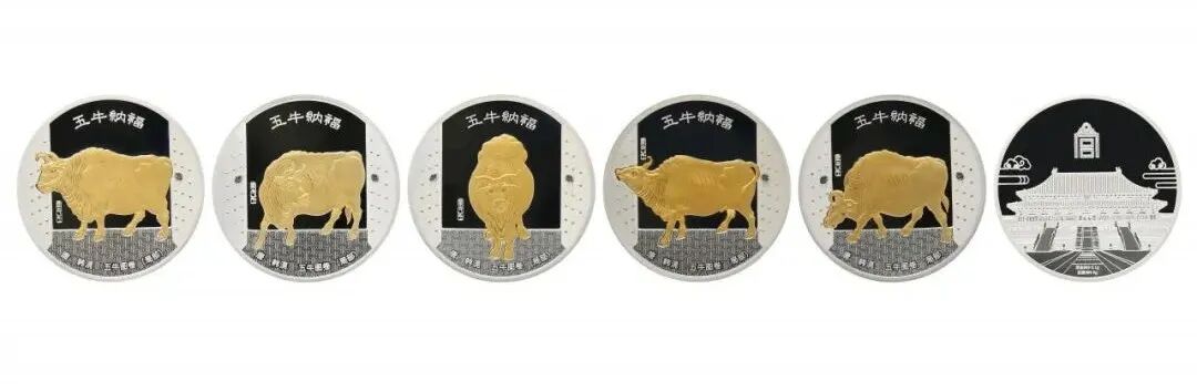 正面“五牛”立于宫门前,吉祥纹饰环绕四周,寓意牛年开门大吉,金牛送福进门。