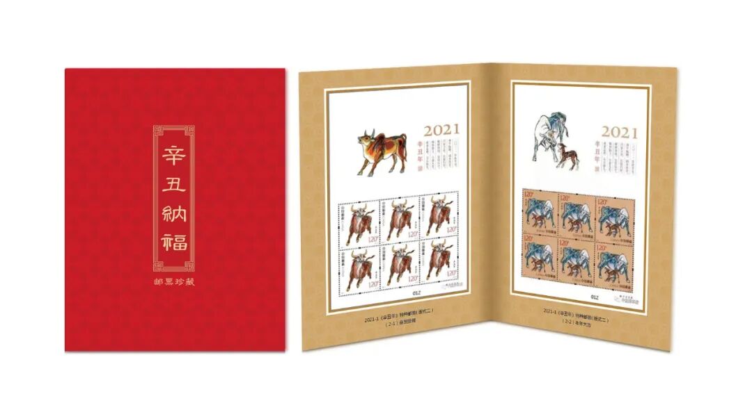 产品配套收录《辛丑纳福》邮票珍藏邮折,内含2021年《辛丑年》邮票小版一套,邮票第一枚“奋发图强”描绘了雄壮有力、一往无前的奔牛形象。第二枚“牛年大吉”通过大牛与小牛舐犊情深的画面,传递家庭兴旺和谐,团圆美满的美好祝愿。小版设计画面匠心独运,通过延伸形神兼具的生肖牛形象,完美呈现了“奋发图强”与“牛年大吉”的邮票画面精髓,同时运用丰富的色彩和兼具现代感的设计体现了生肖文化的神韵。