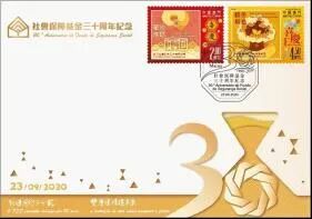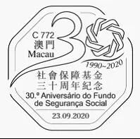 (图7) 5.为庆祝澳门社会保障基金三十周年,澳门邮电局特定于2020年9月23日,刻启编号为C772的“社会保障基金三十周年纪念”纪念邮戳(图8),在澳门邮政总局集邮商店设置临时柜台,为市民提供加盖纪念邮戳服务。同时派发纪念此活动之贴票连盖销纪念封(图9)