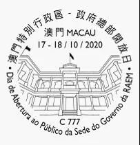 (图13) 8.为配合澳门特别行政区政府总部开放日的举行,澳门邮电局特定于2020年10月17日及18日刻启编号为C777的“澳门特别行政区 – 政府总部开放日”纪念邮戳(图14),在澳门何鸿燊博士大马路 – 政府总部对面设置临时柜台,为市民提供加盖纪念邮戳服务。同时发售一套纪念此活动之纪念封及明信片配以精美封套,售价为澳门币20元(图15,图16,图17)