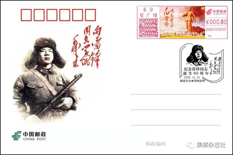 经中国邮政集团有限公司批准,长沙市邮政分公司将于2020年12月18日启用“雷锋同志诞生80周年”邮资机宣传戳1枚,图案为向雷锋同志学习。为了方便大家的收藏,《集邮》杂志微店今天为大家上架了“雷锋同志诞生80周年”邮资机宣传戳相关邮品。