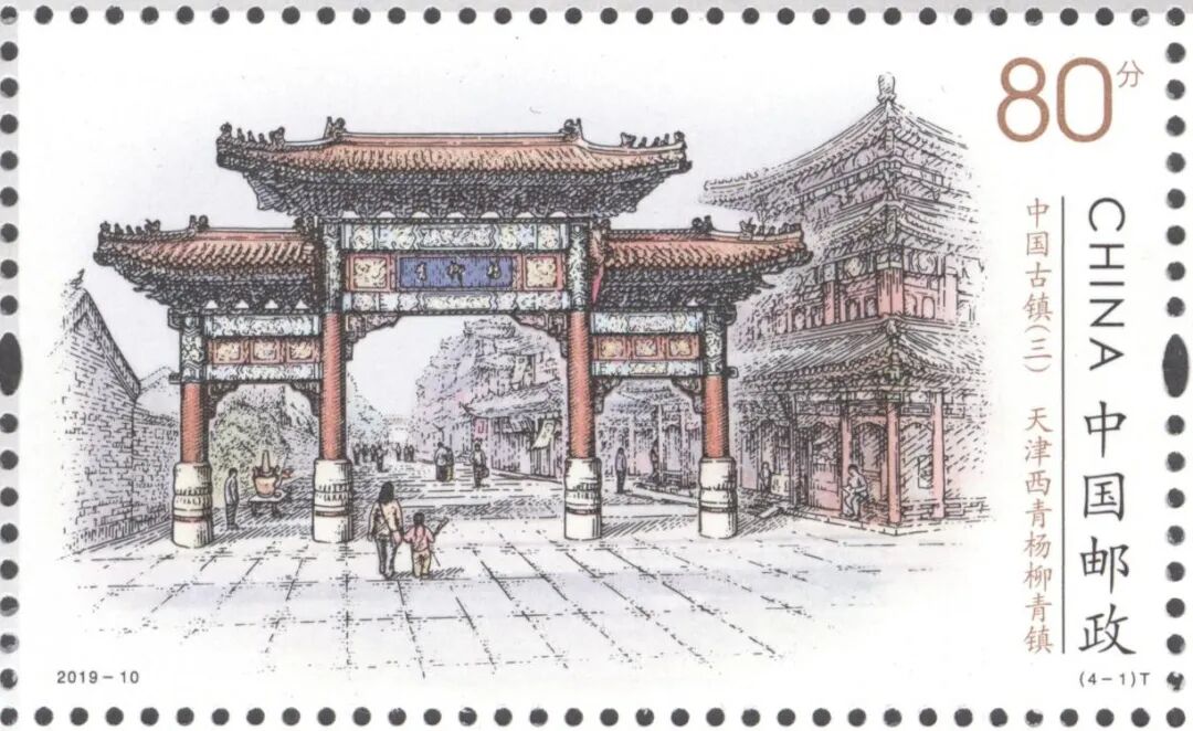 杨柳青镇位于天津市西青区。古镇完整地保留了文昌阁、石家大院等历史文化遗迹,它们与镇内古朴的清代街衢、秀美的古运河风光和多彩的民间艺术共同构成了杨柳青淳美的风俗画卷。2019年发行的《中国古镇(三)》邮票第一图即为“天津西青杨柳青镇”,邮票画面以实景为基础,采用雕刻布线配合淡彩的表现形式,整体颜色淡雅秀丽,通过表现民居、水景、植被,营造出古镇的唯美意境。