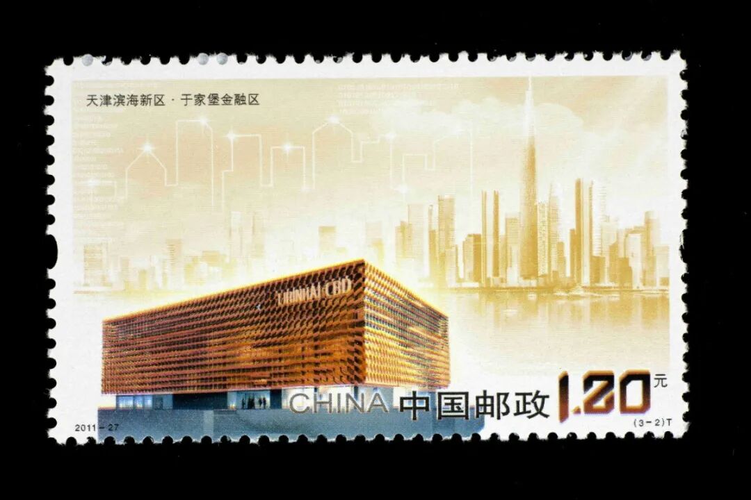 天津市滨海新区位于天津东部沿海,是北方首个自由贸易试验区、全国综合配套改革试验区、国家自主创新示范区。2011年发行的《天津滨海新区》邮票一套三枚、小型张一枚。第一枚“宜居新城”图案中包含北塘古镇和泰达MSD的概念图等;第二枚“于家堡金融区”图案包含于家堡行政管理中心和于家堡金融区的规划图;第三枚“国家动漫园”图案包含动漫大厦和国家动漫园标识及规划图;小型张主图为天津港。邮票采用线条简洁、色彩明快、具象与抽象相结合的设计手法,生动反映了滨海新区的发展成就和美好前景。图案巧妙地将现代城区与文明古镇有机结合,色彩构图清新亮丽,全面展现了天津滨海新区宜居、宜商、宜旅的新区特色。