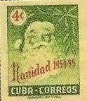 圣诞老人初现邮票是在1954年,比圣诞树登上邮票晚1年。这是古巴发行的全套2枚同图异色异值的圣诞邮票,邮票本身并不贵,但它的无齿版式却不多。下图所示就是该套邮票其中1枚,绿色底图上是个戴着帽子的圣诞老人,下方写有红色的西班牙文“圣诞节1954-55”。当时的古巴还不是卡斯特罗当政,所以位于拉丁美洲的古巴受到美国文化影响,不但发行圣诞邮票,还在票面上引入了美国的圣诞老人形象。