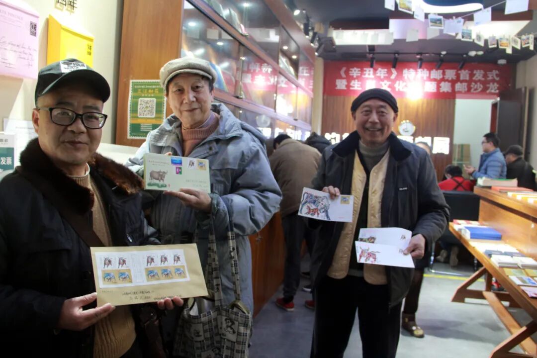 首发当日与《辛丑年》生肖邮票一同发行的还有生肖首日封、纪念封、纪念邮折和纪念邮册等特色邮品,深圳邮政特别设计制作了精美的纪念封、纪念戳,在首发式活动现场为市民和“邮迷”朋友免费提供盖戳服务,大受邮迷追捧。