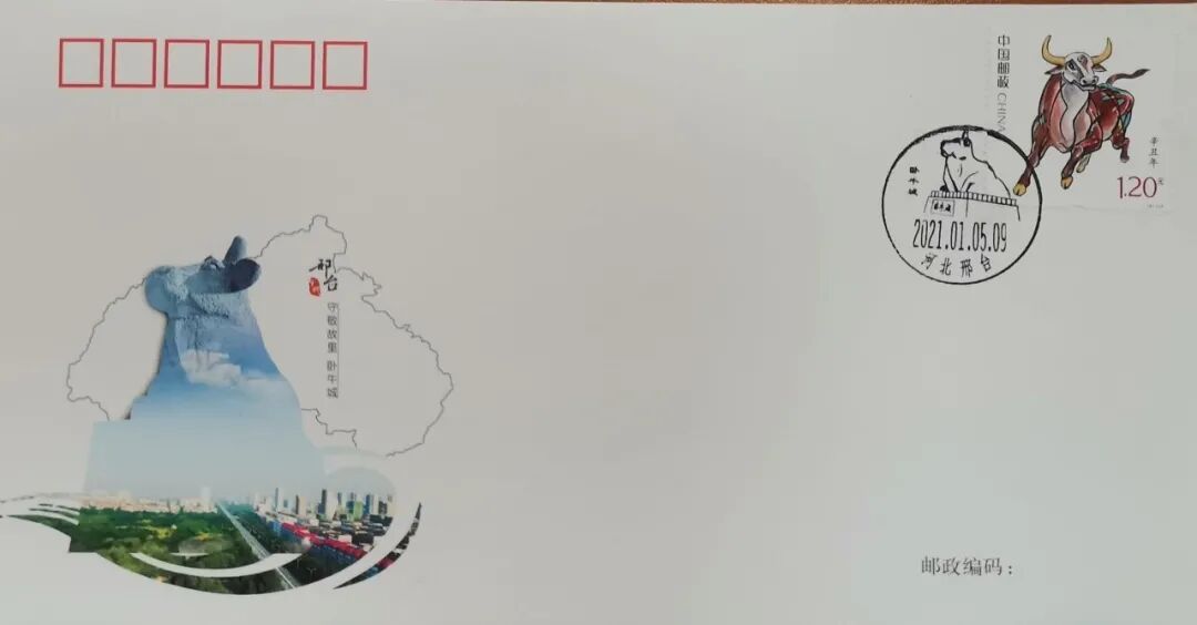 1月5日,为配合牛年生肖邮票的发行,中国邮政集团有限公司邢台市分公司报请集团公司审批,制作卧牛城文化日戳一枚,这枚日戳的图案为邢台市的标志,卧牛城雕塑原型,采用回墨式制作。从邢台邮政部门得知,“卧牛城”文化日戳是经过特批,使用牛形象文化戳,全国仅三地被批准使用,使用期限从1月5日到4月5日。邢台市邮政分公司专为此次《辛丑年》特种邮票发行制作发行纪念封一枚,加贴《辛丑年》特种邮票第一枚“奋发图强”,供集藏爱好者收藏、实寄。纪念封、“卧牛城”文化日戳的设计者是郭学经,纪念封文字撰写杨文忠。(闻锺)