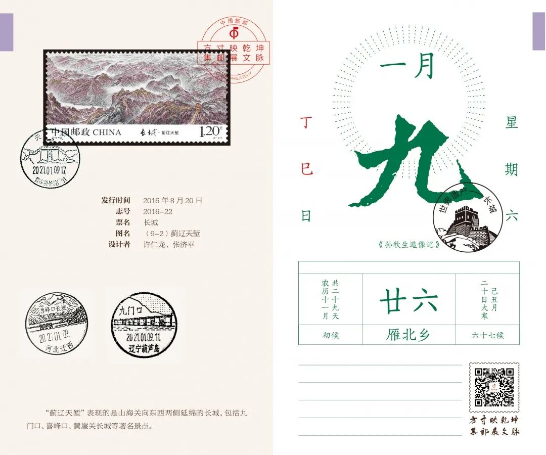 本枚“蓟辽天堑”表现的是山海关向东西两侧延绵的长城,包括九门口、喜峰口和黄崖关等。当你奔走于崇山峻岭笑傲北风狂啸,当你指尖触摸到见证了血与火历史的坚硬城砖,于是浓缩于小小一枚邮票上的那些关口伫立在眼前,再凝聚成烙印在日历上的日戳,此时此刻,邮票与日戳相映衬的极限,是你心中最欣慰的暖。