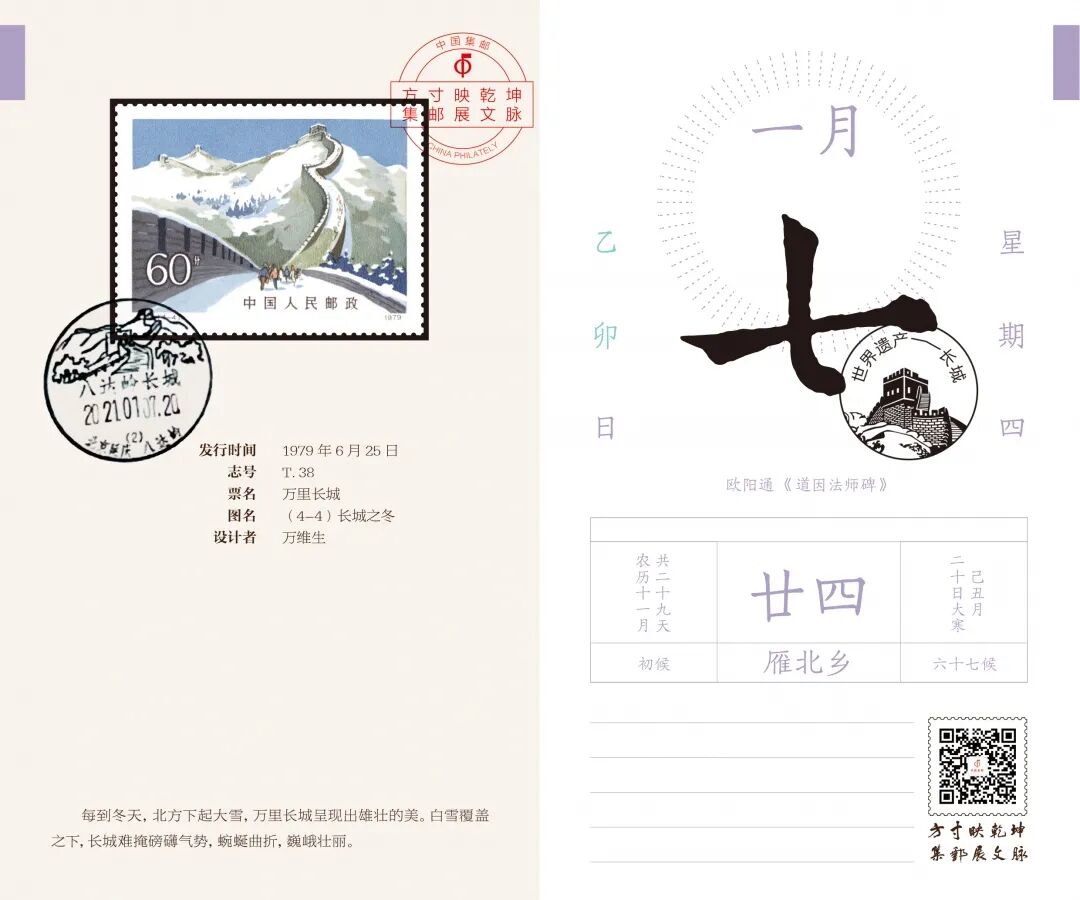 今年伊始,我们开始在社交媒体上每日更新电子日历,顺着邮票上的蜿蜒长城,跨越河北、辽宁、天津、北京、山西、陕西、内蒙、宁夏、甘肃等省市,一路集合了山海关、虎山长城、九门口、喜峰口、黄崖关、慕田峪、八达岭、娘子关、雁门关、杀虎口、偏关、老牛湾、镇北台、宁夏镇、固原镇、盐池、三关口、青铜峡、嘉峪关等重要关口、地点邮局的当日邮戳。每逢国家、集邮界重大盛事,如1月1日《民法典》发布、1月5日生肖邮票发布、1月10日总公司66周年生日,我们也会在电子日历上呈现相应邮票、邮戳。集有趣,邮有味,极限集戳让邮戳变得生动,让邮票变得立体,让世界遗产变得多维。文化之功,一曰担当,一曰传情;集邮文化之功,在于通过集邮互动活动传达对生活的热爱、对集邮的深情。