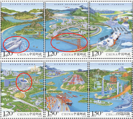 第一图《共抓大保护》原形就是来自武汉的长江江豚“淘淘”一家三口;第二图《综合立体交通走廊》中,一座红色的桥梁格外醒目,那便是武汉鹦鹉洲长江大桥;第四图《新型城镇化》中,一朵“马蹄莲”占据邮票正中位置,那是武汉未来科技城的地标性建筑——武汉新能源研究院。