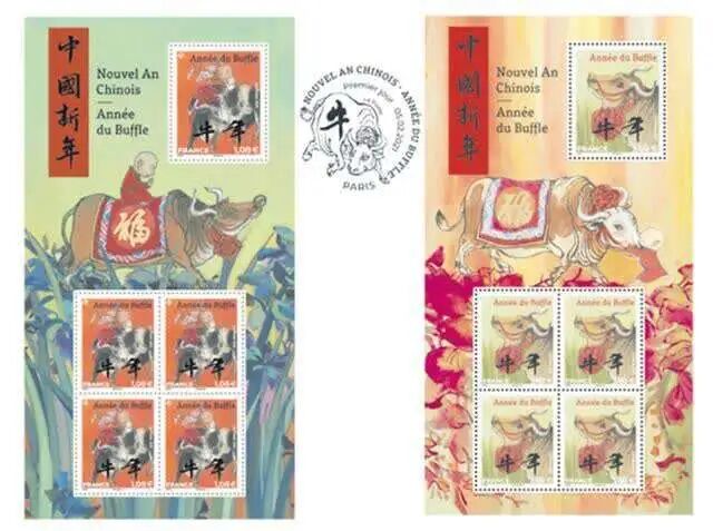 法国邮政将于当地时间2月8日公开发行销售一套牛年邮票。根据样张,绿色邮票上是一个手持梅花的男童,骑在一头戴着大红花的大公牛背上,仿似在默念,而另一张则绘有一头昂首的大公牛,精气神十足。