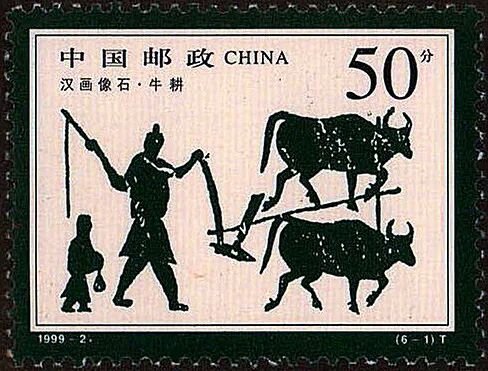 1952年3月15日发行的《和平解放西藏》纪念邮票的第2、4枚,图案描绘了西藏农民用牦牛耕田的情景;1988年5月25日发行的《敦煌壁画(第二组)》特种邮票的第3枚“北周·农耕”,图案描绘了农耕的场景。