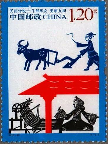 2010年8月16日发行的《牛郎织女》特种邮票第2枚“男耕女织”(图6),图案是牛郎扶着牛犁耕地画面;1952年1月1日发行的《土地革命》特种邮票,画面有一位农民扶牛犁耕的场景;