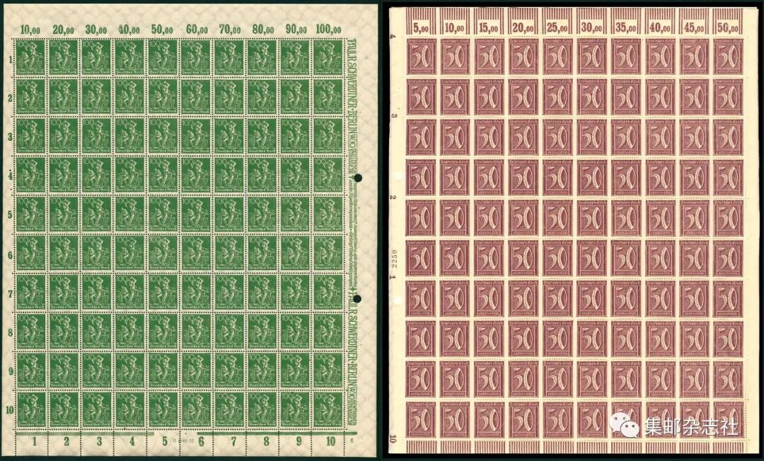 010号 德国1921年面值数字邮票50芬尼100枚整版1版、采矿邮票100枚整版1版