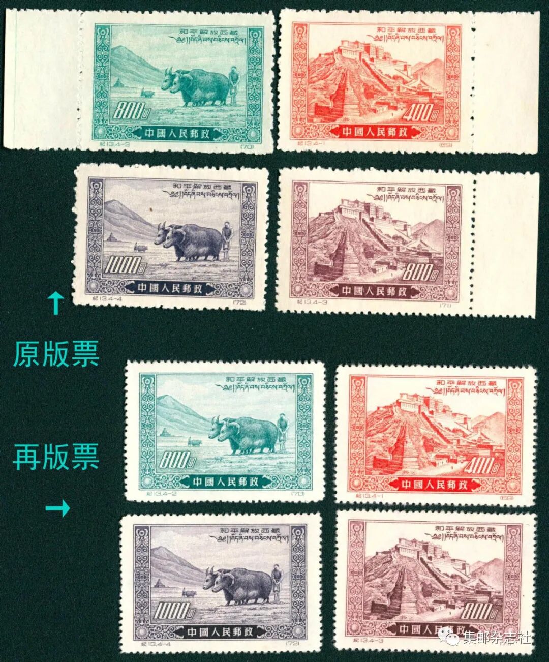 007号 纪13西藏原版、再版各一套共8枚全新票(原版票有边纸)