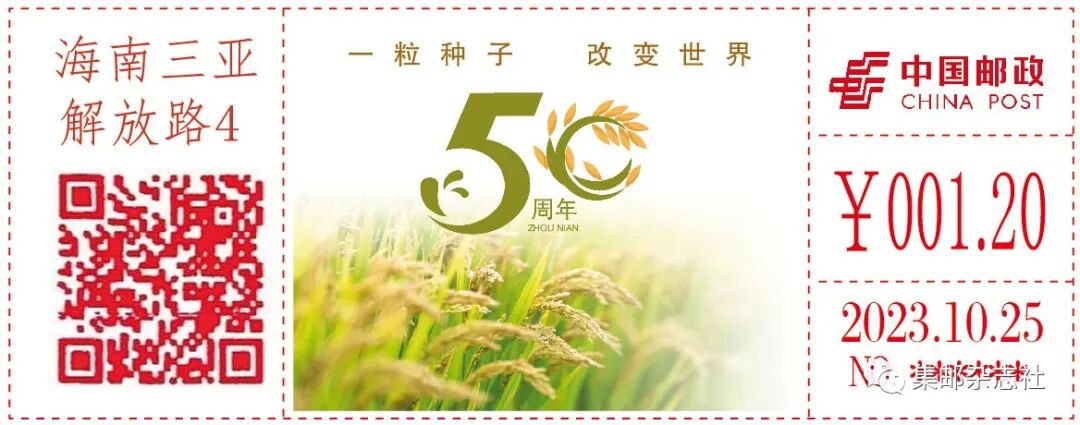 经中国邮政集团有限公司批准,海南省三亚市邮政分公司将于2023年10月25日在解放路邮政支局启用“世界上第一株灿型杂交水稻培育成功50周年”彩色数字打印型邮资机戳一枚。