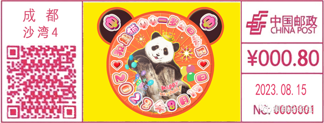 2023年8月15日,四川省成都市沙湾邮政支局启用“‘熊猫中中’一周岁”彩色数字打印型邮资机戳一枚。为配合邮资机戳的启用,当天还推出明信片一枚。