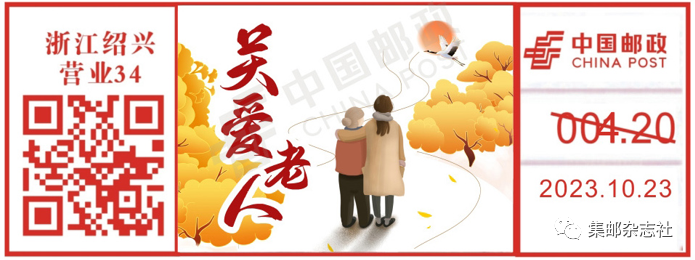 经中国邮政集团有限公司批准,浙江省绍兴市邮政分公司将于2023年10月23日启用“关爱老人”彩色数字打印型邮资机戳一枚。