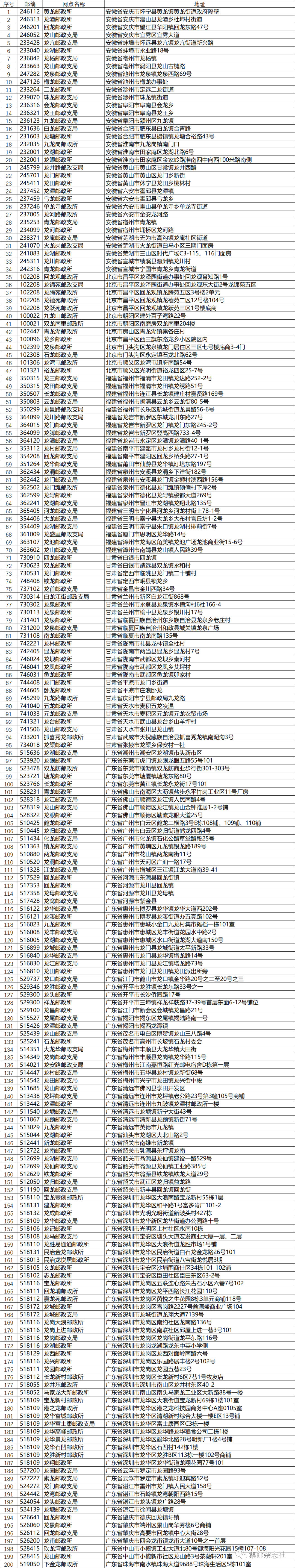 目前,中国邮政所属的54000余家邮政网点中带有“龙”字的局所网点共有1300多家。从今天起,《集邮》杂志微信公众号为大家介绍这些带“龙”字的网点信息。今天先为大家介绍安徽、北京、福建、甘肃、广东等省、市带有“龙”字的邮政网点信息。