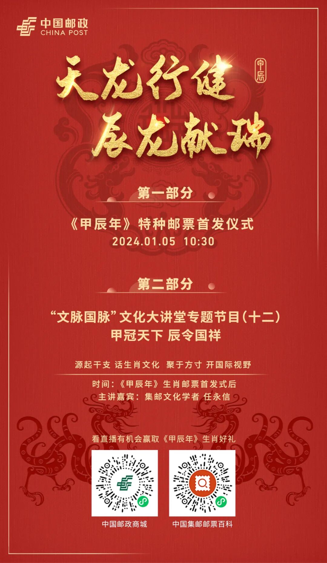 《天龙行健 辰龙献瑞》——甲辰年特种邮票首发仪式将于2024年1月5日10点30分举办,活动将以生肖龙票为依托,聚焦龙的文化、龙的精神、龙的传人,全方位深入解读龙的故事并启动《甲辰年》生肖邮票及《甲辰年》邮票三地小全张的发行。