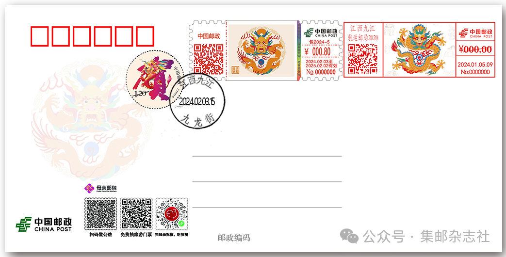 使用明信片为载体,2月3日加盖“云龙五福”彩色数字打印型邮资机戳,另盖当日启用的0.80元面值“祥龙”彩色数字粘贴型邮资机戳一枚,加贴“龙腾贺岁”邮票一枚,盖销“江西九江 九龙街”日戳,挂号实寄给预订者。识别上方二维码即可预订。