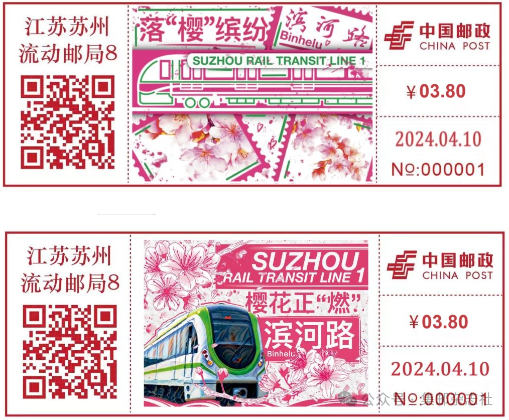 经中国邮政集团有限公司批准,江苏省苏州市邮政分公司将于2024年4月10日启用“落‘樱’缤纷滨河路”“樱花正‘燃’滨河路”彩色数字打印型